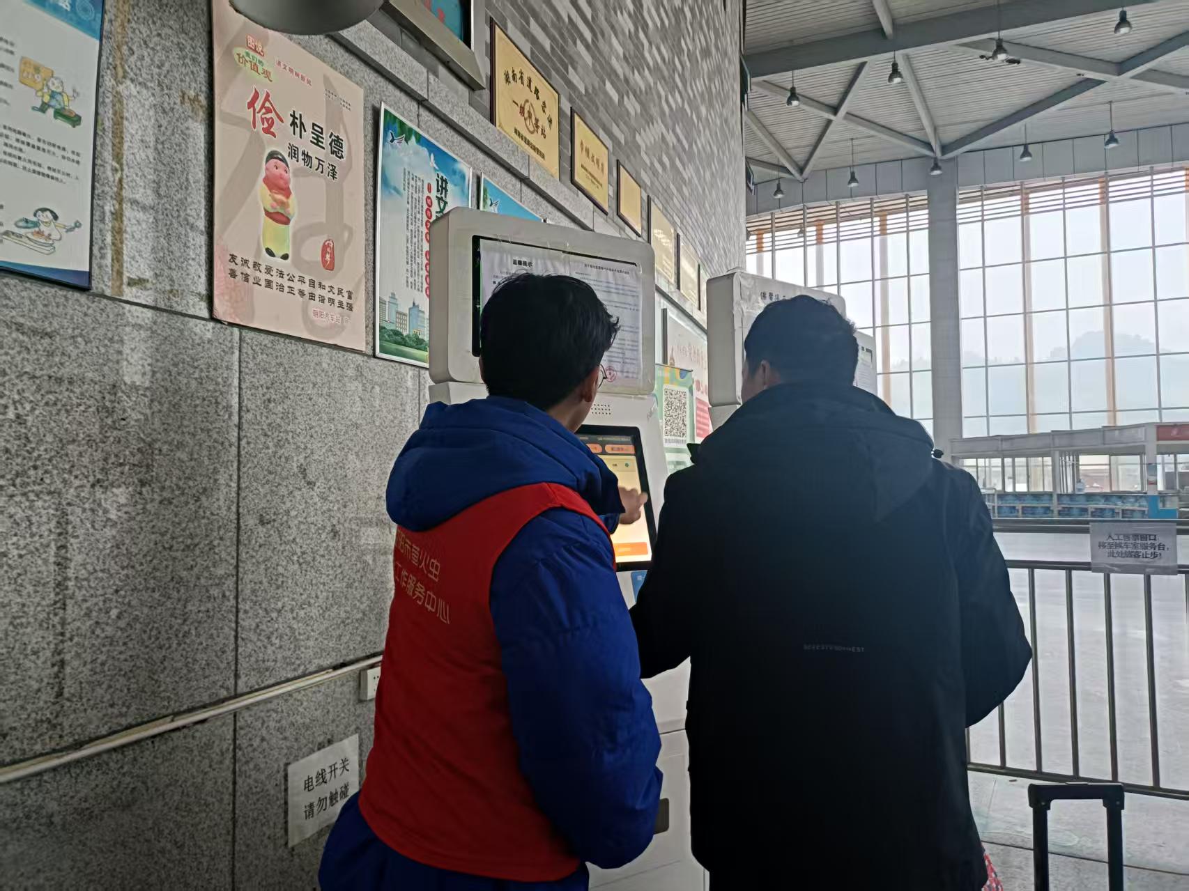 2月13日9:00,朝阳汽车站进站处一个身穿红马甲的“工作人员”正在自助售票机前指导旅客买票。这是外事旅游运输分公司联合益阳萤火虫社会工作服务中心在春运期间开展的“暖冬行动 情满旅途”春运志愿服务。