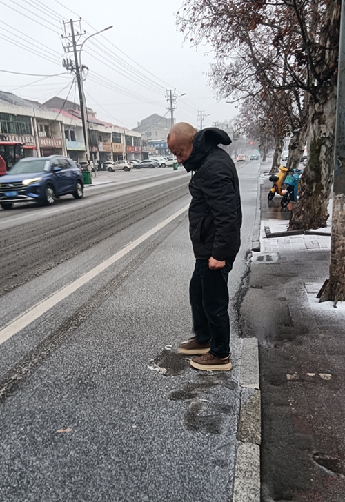 1月20日清晨5:30,益阳湘运公共交通有限责任公司副经理王鹏正在319国道结冰路段进行实地勘查。这是该司应对近日雨雪冰冻天气保障安全运输的举措之一。